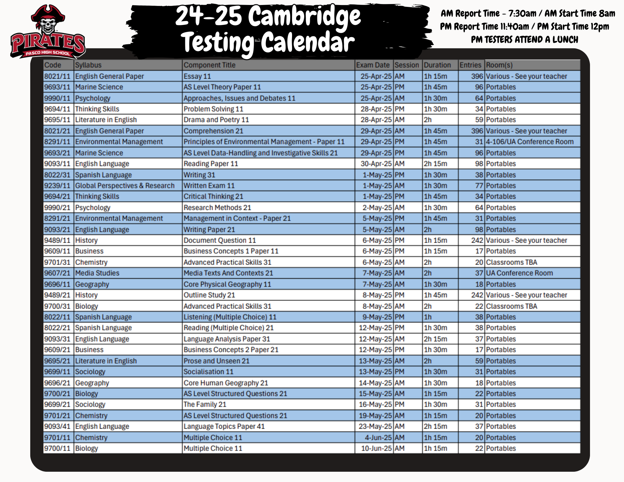 Please review the testing calendar below,